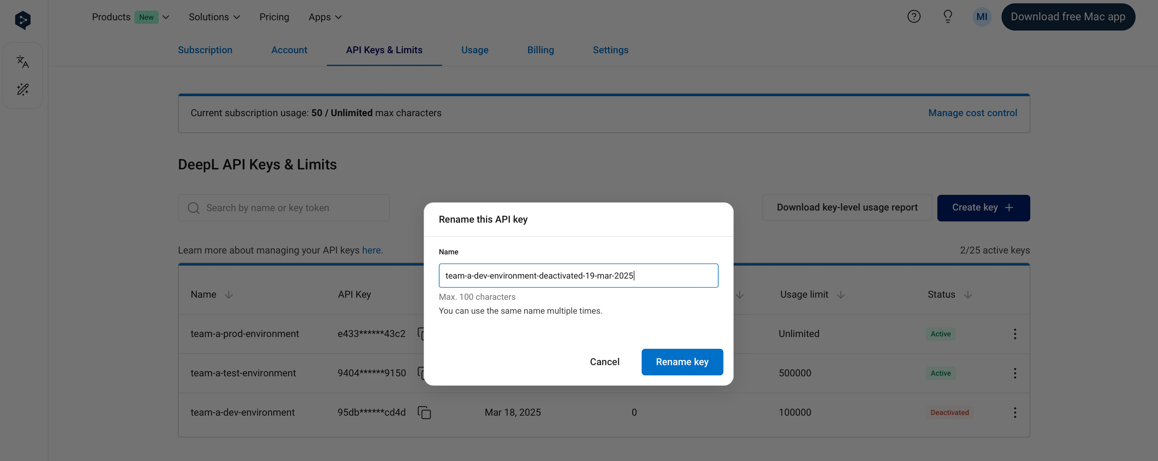 Allows you to edit the name of an API key. Note that it is possible for two keys to have the same name. Both active and deactivated keys can be renamed.