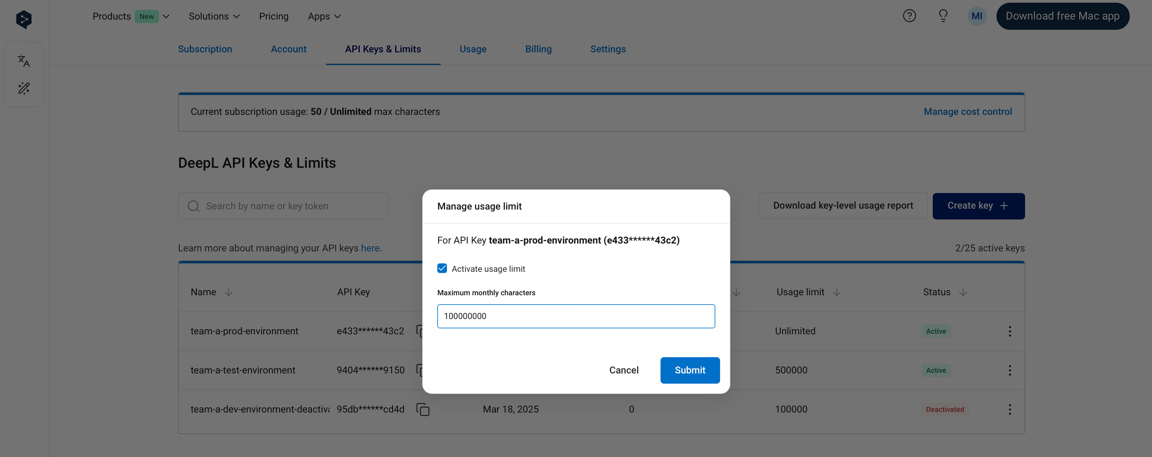 It’s possible to set an API key-level usage limit. Key-level limits restrict the number of total characters (across text translation, document translation, and text improvement) that can be consumed by an API key in a one-month usage period. You can see the dates of your current usage period in the Usage tab. For example, if you set a key-level usage limit of 1,000,000 characters, the API key will not consume more than 1,000,000 characters per usage period. In the “API Keys & Limits” tab, the “Characters consumed” column in the API keys table shows the number of characters consumed by an API key in the current usage period. The character count will “reset” at the start of the next usage period, at which point the key will again be able to consume characters. As with subscription-level cost control:- You’ll receive notification emails when 80% and 100% of a key-level limit has been reached